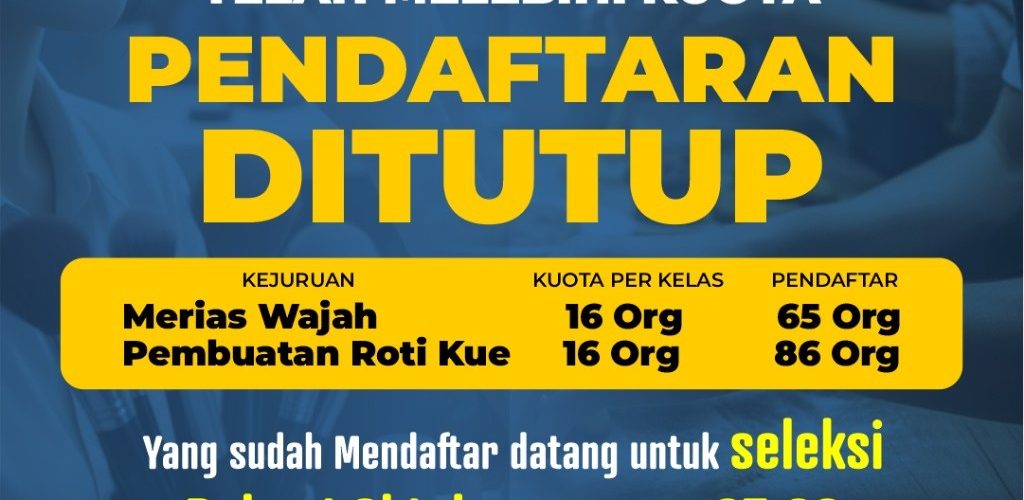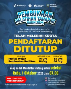 Balai Latihan Kerja (BLK) Kabupaten Rembang resmi membuka pendaftaran pelatihan kompetensi merias wajah dan pembuatan kue pada Senin (29/9/2025). Hanya dalam satu hari, pendaftaran langsung ditutup karena kuota sudah terpenuhi.