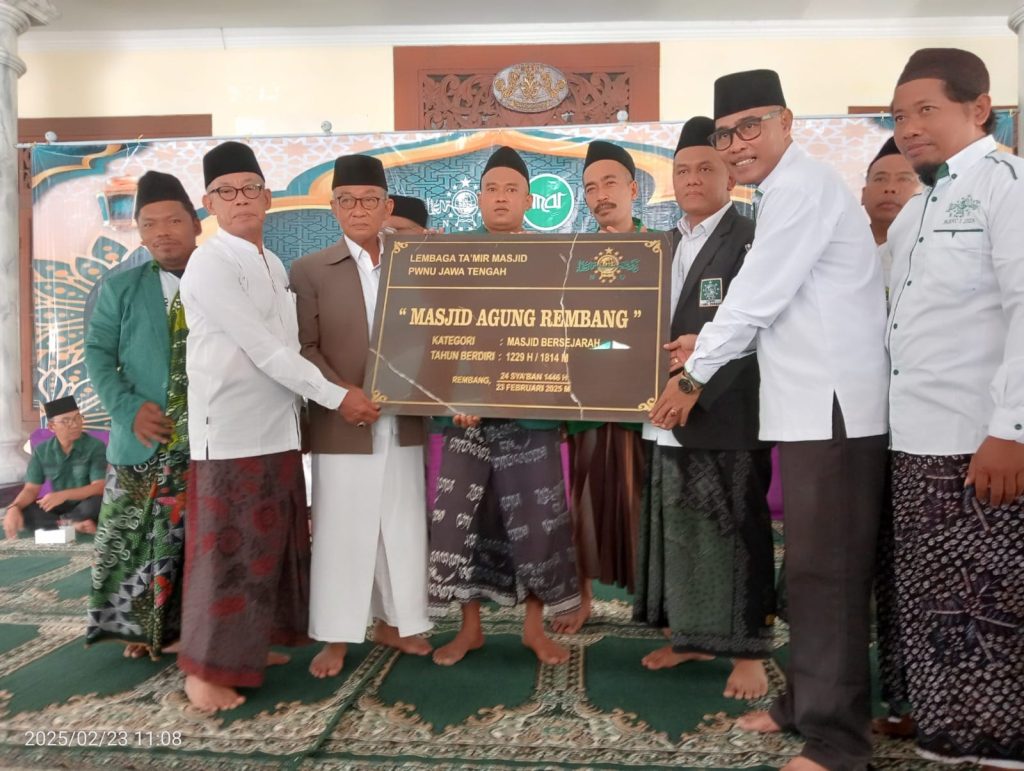 Masjid Agung Rembang resmi ditetapkan sebagai masjid bersejarah oleh Lembaga Takmir Masjid (LTM) Pengurus Wilayah Nahdlatul Ulama (PWNU) Jawa Tengah. Penetapan tersebut ditandai dengan penyerahan prasasti kepada jajaran takmir Masjid Agung Rembang pada Minggu pagi (23/2) di serambi masjid setempat.