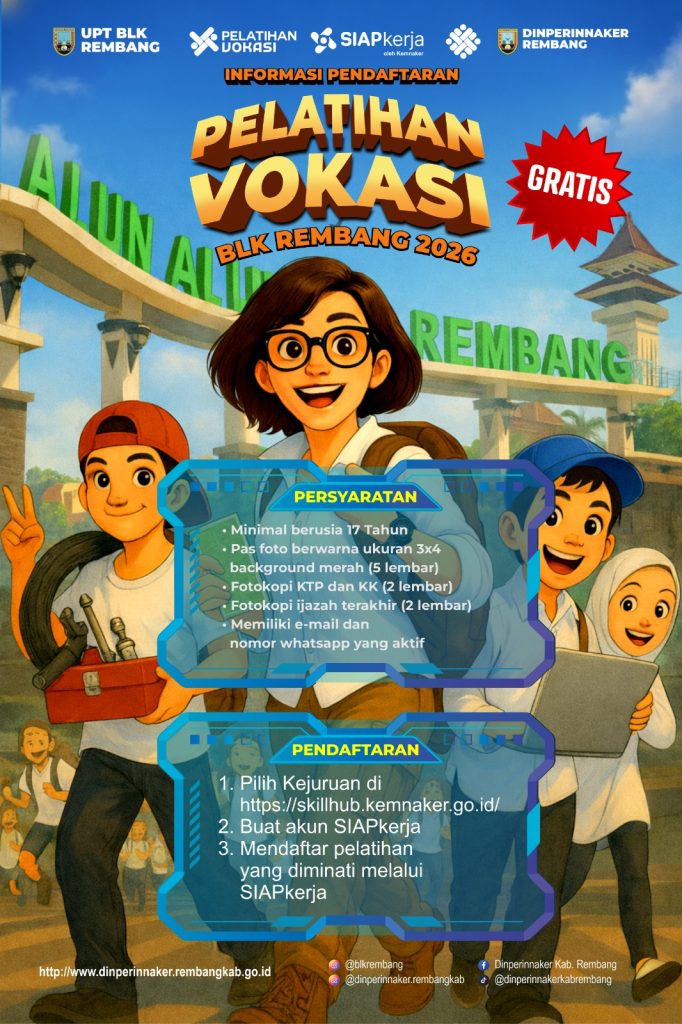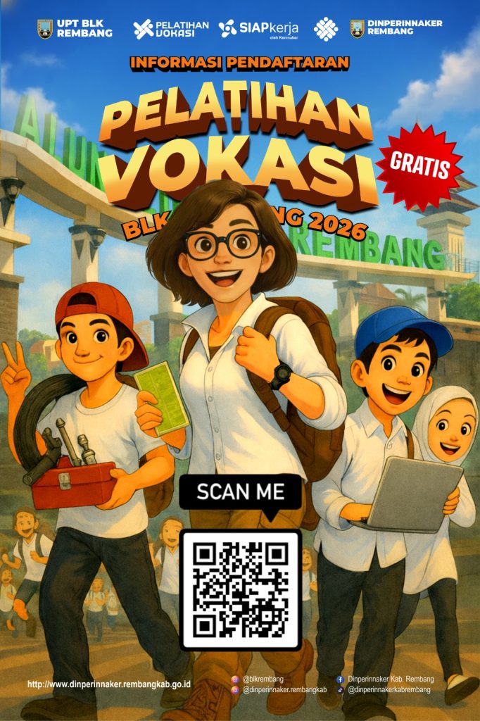 Pemerintah Kabupaten Rembang membuka pendaftaran pelatihan vokasi tahun 2026 mulai 26 Januari 2026. Pelatihan vokasi ini merupakan pelatihan keterampilan kerja praktis yang dirancang untuk membekali masyarakat dengan keahlian siap pakai agar lebih mudah terserap di dunia kerja maupun mampu membuka usaha mandiri.