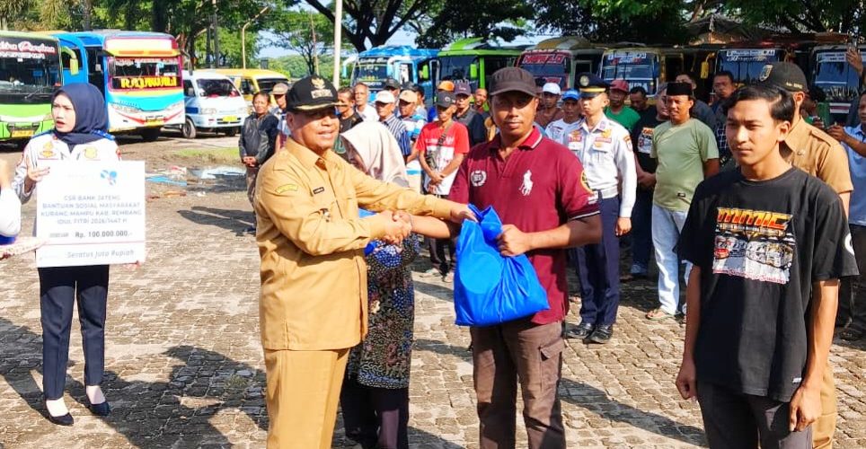 Pemerintah Kabupaten (Pemkab) Rembang menyalurkan bingkisan Lebaran berupa paket sembilan bahan pokok (sembako) kepada awak angkutan umum dan juru parkir, Senin (16/3/2026).