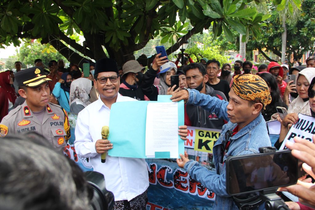 Dalam pertemuan tersebut, Bupati menandatangani pernyataan menerima dan menindaklanjuti aspirasi warga. Setelah dari Kantor Bupati, warga melanjutkan penyampaian aspirasi mereka di area pabrik yang dimaksud.