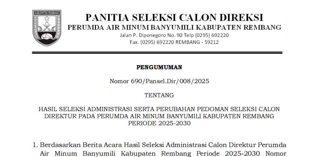 Pengumuman Hasil Seleksi Administrasi serta Perubahan Pedoman Seleksi Calon Direktur pada Perumda Air Minum Banyumili Kabupaten Rembang Periode 2025-2030 Redaksi 20 jam ago Pengumuman selengkapnya dapat dilihat disini!