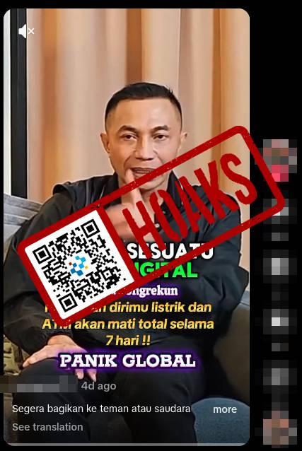 Beredar di media sosial TikTok unggahan video yang menampilkan nama Dharma Pongrekun, disertai klaim bahwa listrik dan layanan ATM di Indonesia akan mati selama tujuh hari ke depan. Unggahan tersebut disertai dengan narasi sebagai berikut “Persiapan Menghadapi Listrik Mati Selama 7 Hari Pelajari cara bertahan hidup 7 hari tanpa listrik. Siapkan diri sebelum terjadi kepanikan! #dharmapongrekun #panikglobal #beritaviral.”