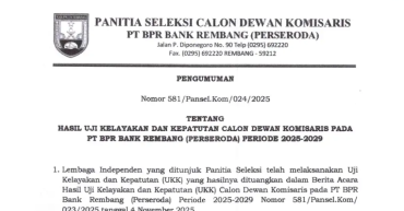 PENGUMUMAN HASIL UJI KELAYAKAN DAN KEPATUTAN CALON DEWAN KOMISARIS PADA PT BPR BANK REMBANG PERIODE 2025-2029