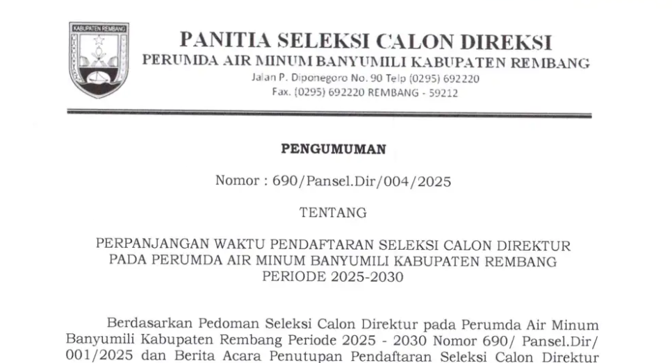 PENGUMUMAN PERPANJANGAN PENDAFTARAN SELEKSI CALON DIREKTUR PERUMDA AIR MINUM BANYUMILI PERIODE 2025-2030 Redaksi 3 minggu ago Pengumuman lengkapnya dapat dilihat disini!